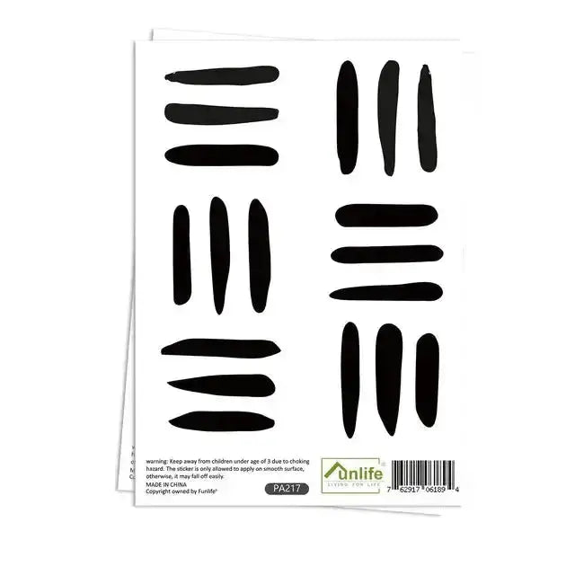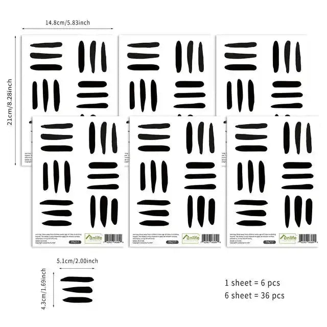 Transform your space with our modern abstract lines wall stickers, featuring 36 designs across 6 sheets (14.8cm/5.83inch). This collection showcases bold, minimalist brush strokes in striking black that create dramatic visual impact. Each sticker is precisely designed to form geometric patterns perfect for contemporary interiors. The varying lengths and thicknesses of the lines allow for dynamic arrangements that bring sophistication to any room. Made from premium removable material, these stickers ensure easy application and repositioning without wall damage. Ideal for living rooms, offices, or creative spaces seeking modern artistic flair. The classic black palette creates strong contrast and pairs seamlessly with any interior style, from Scandinavian to industrial modern. Whether designing a statement wall or adding subtle accents, these abstract line stickers offer versatile decorating possibilities. The fade-resistant colors maintain their deep intensity, while professional-grade adhesive provides lasting durability. Create an artistic gallery wall that combines minimalist design with bold expression.